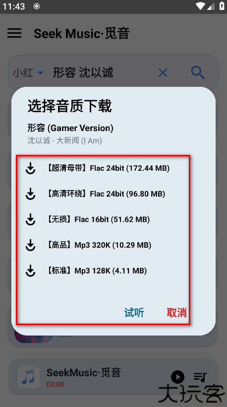 3、点击下载图标,系统会提供多个音质选择,按需点击后开始缓冲。