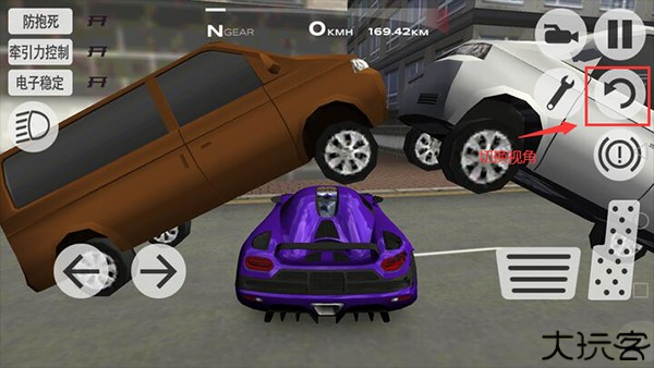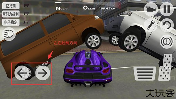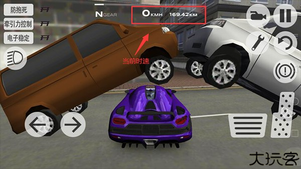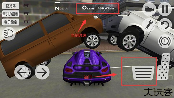 1、进入游戏后,可以看见屏幕上的虚拟按钮,它们都是可以控制车子的。