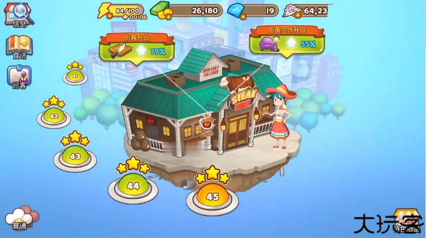 4、完成关卡任务获得奖励,可用于解锁新餐厅、食谱、升级厨具和装修餐厅。