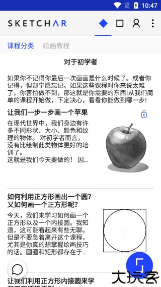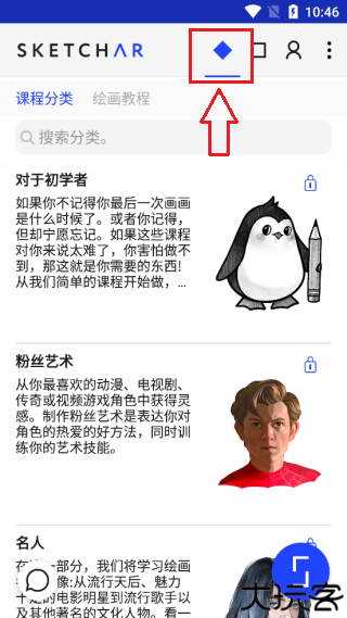 打开首页后点击上方图标,进入绘画教程中心挑选感兴趣的教学模块。