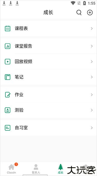 课程表、课堂报告、回放视频、笔记、作业、测验、自习室。