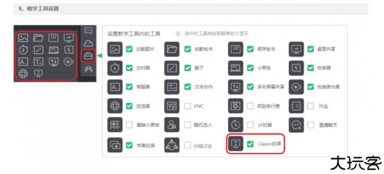 Classln教室“教学工具”中默认不显示“classln投屏”工具,请在学校后台一学校设置一教室设置-5.教学工具设置中,勾选开启"ClassIn投屏”。