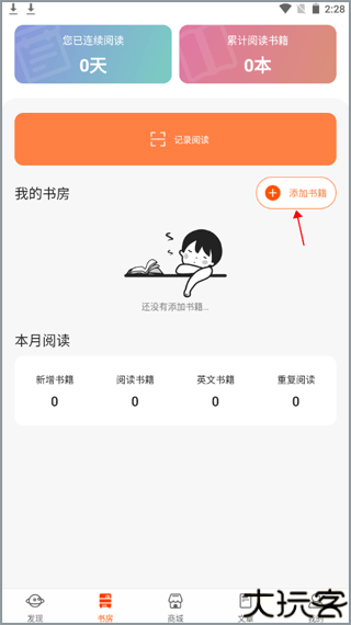 1、进入软件主界面,点击下方菜单栏里的书房,选择添加书籍。