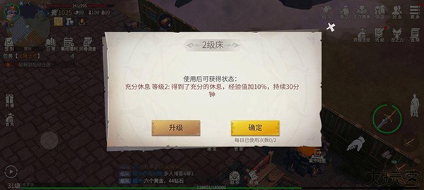 4、床每天提供两次免费的经验加成还是很香的,玩家升级以后获得经验和持续时间都有增加。