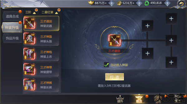 打造红阶2星与3星武具,分别需橙2与红2星材料各五件,不用花费金币