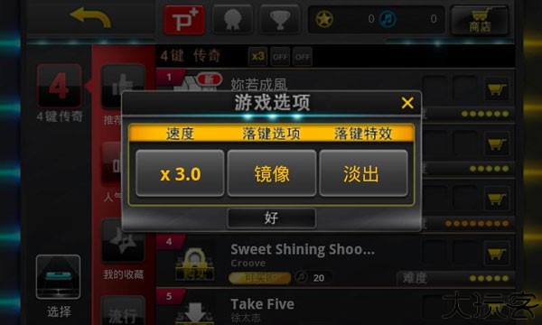 4、可以选择难度、速度、键盘选项、还有落键特效。