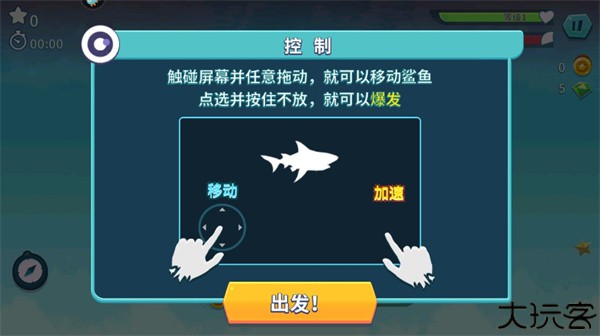 2、触碰屏幕并任意拖动,就可以移动鲨鱼点选并按住不放,就可以爆发。