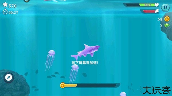 4、按住屏幕可以加速鲨鱼,同时也要注意不要吃到不能吃的东西;