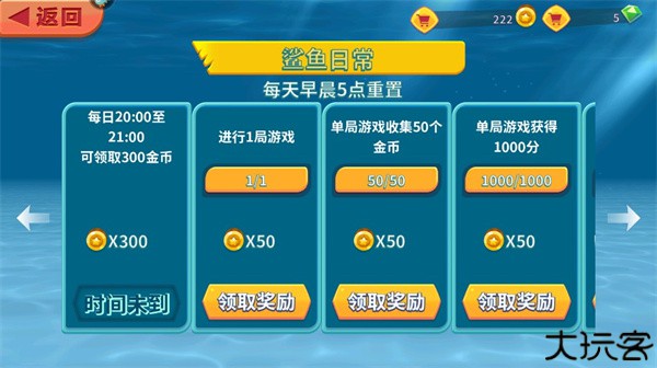 9、在这里玩家可以领取丰厚的奖励,不只是可以对鲨鱼进行装装备,还可以解锁其他模式,除此之外,游戏中还有很多玩法等着玩家们自行下载体验。
