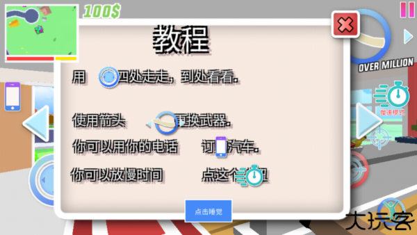 4、进入游戏后,玩家可以看到新手教程,滑动摇杆控制角色移动,点击箭头可以切换武器,点击手机可以订购汽车。