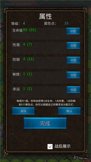 6、接着玩家可以将战斗获得的属性点,以合理地强化自己的角色属性,如生命值、伤害、防御、敏捷、幸运等。