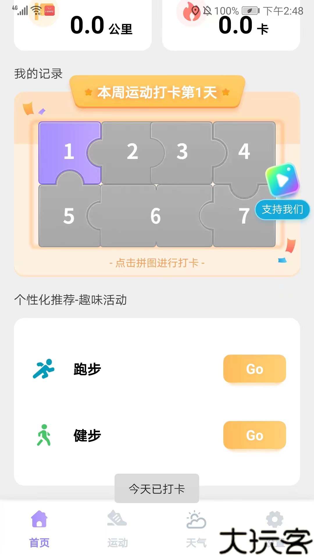4、往下滑动,点击拼图可以进行运动打卡,用户还可以参加软件推荐的跑步和健步活动。