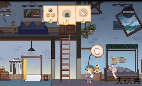 4、拿到帽子之后,玩家要返回在床头上这边有一个闹钟,设置一下,去爬梯子。