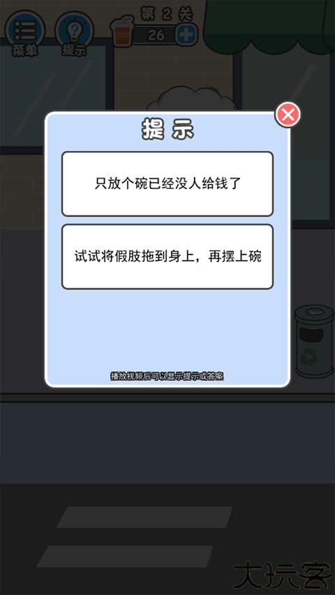 3、好几天没要到钱了,现在拿碗已经讨不到钱了,试试点击路上的假肢再点击碗就可以讨到钱了。