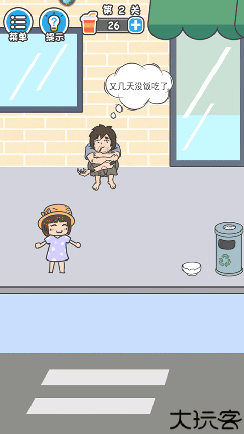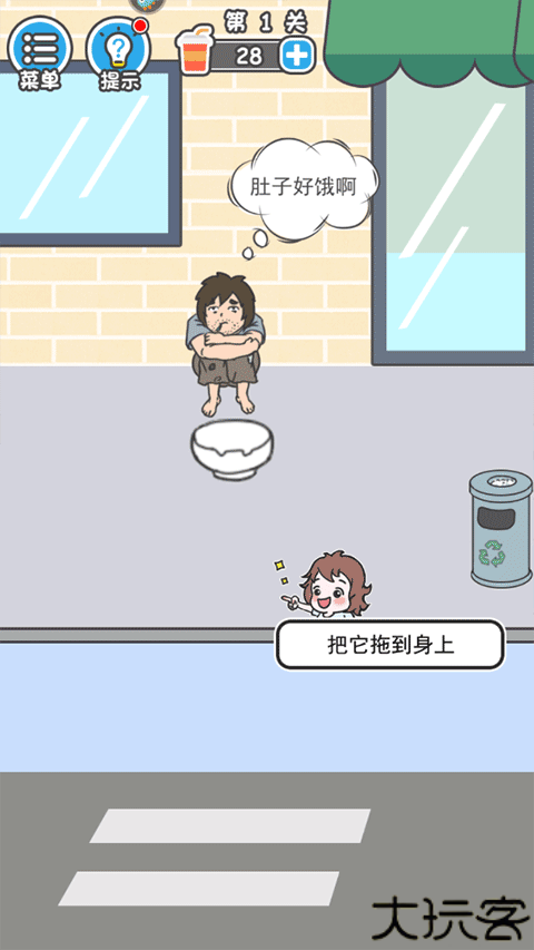 2、捡起路边的碗,按动拖住到乞丐身上,就会有路人施舍一点钱给他,即通关成功。