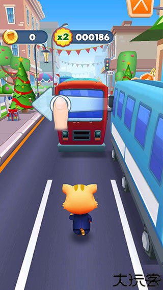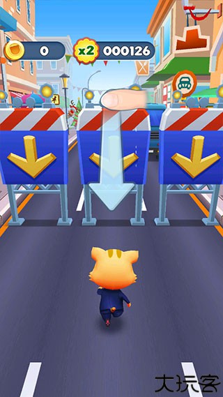 1、带着可爱小猫在城市自由奔跑,收集空中金币。