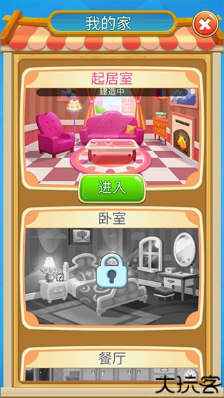 5、完成关卡挑战就可以获得大量金币和钻石,可以自由选择好看的家具进行装饰,右下角绿色按钮可以进入关卡挑战,旗子按钮可以匹配玩家进行比赛,左下角分别是皮肤、任务以及关卡模式。