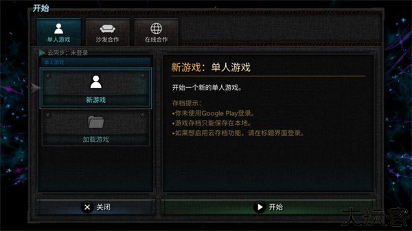2、游戏总共设置了三种模式,分别为单人游戏,沙发合作以及在线合作,还支持使用谷歌账号进行云存档。