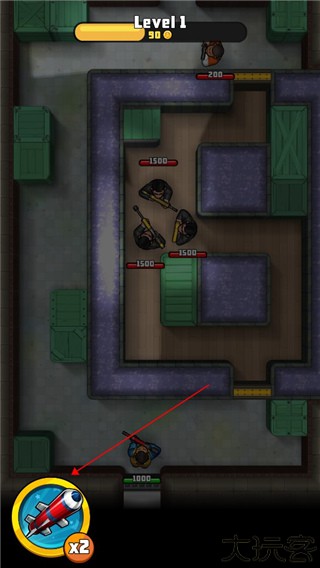 5、击杀所有敌人后进入下一关,点击左下角的火箭直接命中敌人。