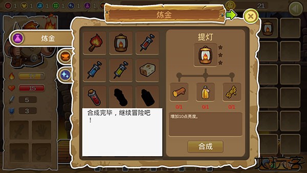 4、在游戏中,玩家可能会血量没有了,或者是灯火没有了,这些都是非常的危险的东西,玩家一但没有了就用现有的装备来合成,当然了如果不合成我们就可以直接的推出地下层,这样冒险的地下层都是不会保存的。