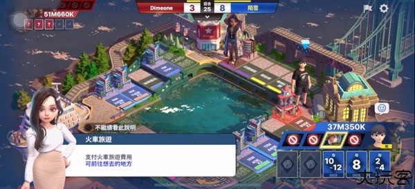 掷骰子前进、购地建造,压迫对手资金至破产。