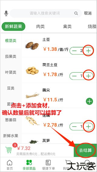 1、启动应用后点击底部“全部商品”,进入食材选择页面。