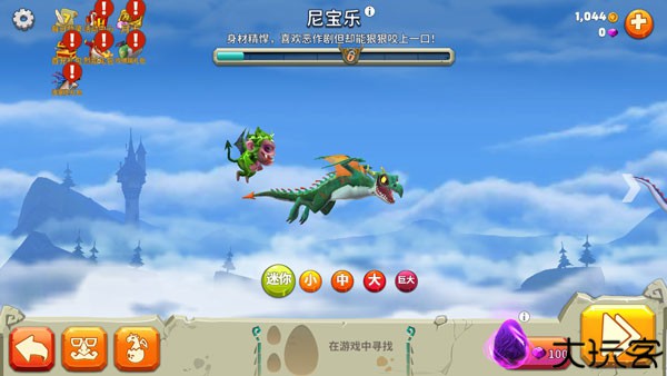 2、玩家初始只有一条小龙,通过在天空中猎食成长。这个游戏的宠物是要自己找蛋来解锁的,而龙是生长度满后解锁下一条的金币购买。