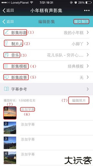 4、添加和修改字幕,调整照片顺序、方向,完成后点击“提交制作”。
