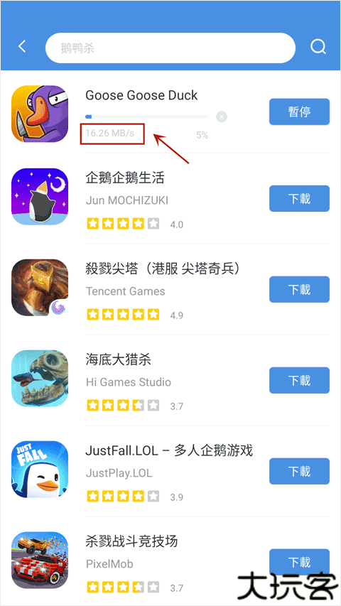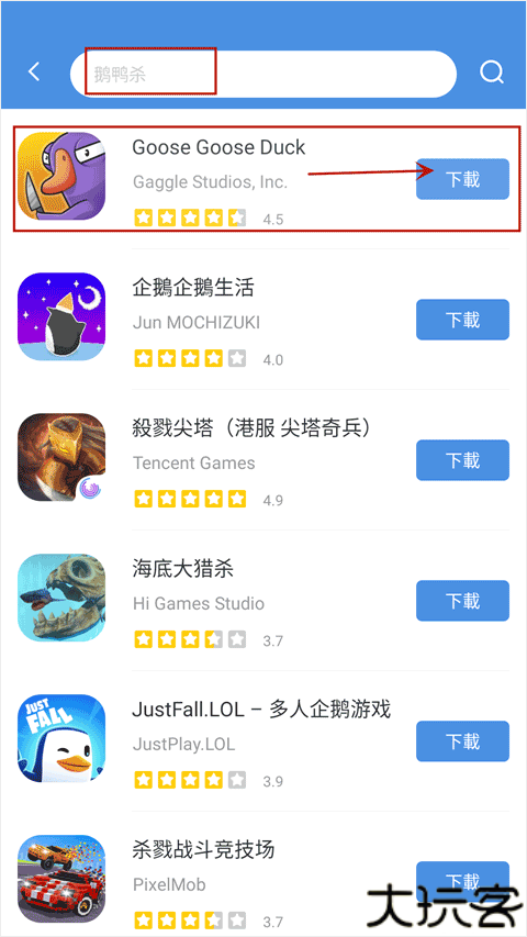 3、以最近火爆的鹅鸭杀游戏为例,当玩家在上方搜索栏输入“鹅鸭杀”即可在下方查看该游戏的评分以及厂商信息,点击一键下载即可。