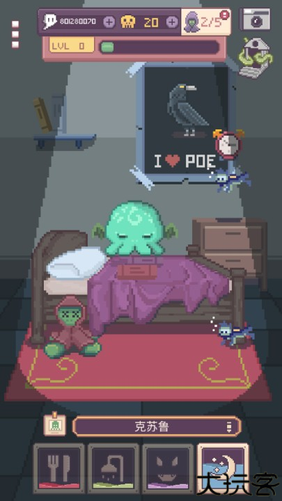 1、游戏中没有什么剧情,主要操作就是点击,非常的简单,甚至说是有点单调吧。如果想要将克苏鲁宠物养大,需要给他吃的东西,清洗,满足它的破坏欲望,最后保证它的睡眠。