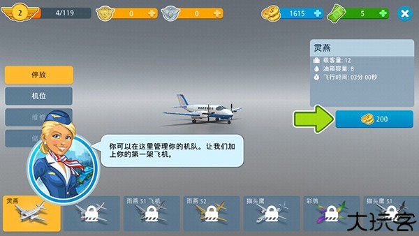 在右下飞机库中进行机型及停机位的解锁设置。
