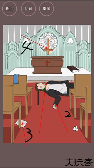 点击十字架、死者手、左下纸张和后方十字架完成线索收集。