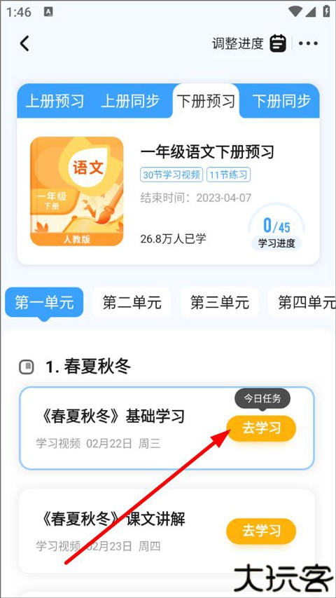 5、随后用户进入学习进度页面后,即可学习当前内容也可调整进度去学习新的内容,再次点击“去学习”。