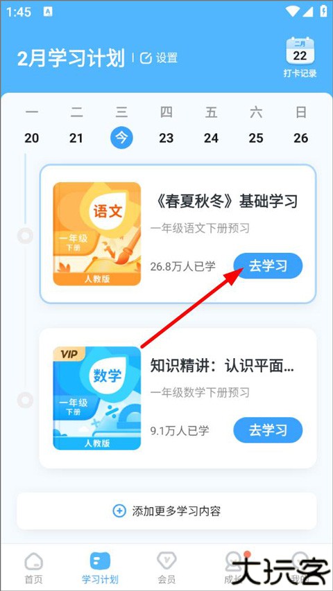 4、打开学习计划页面,用户可查看当天的学习计划,对某一课程点击“去学习”。