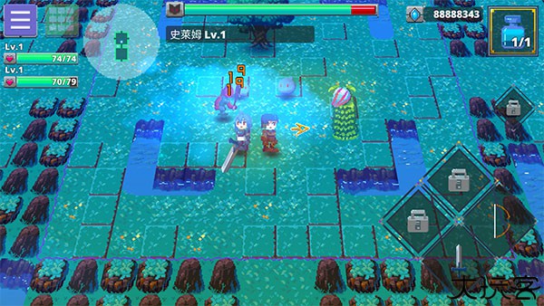 2、玩家召唤伙伴后正式进入探索区,遇到怪物时,可以使用右下角的剑或弓进行攻击。