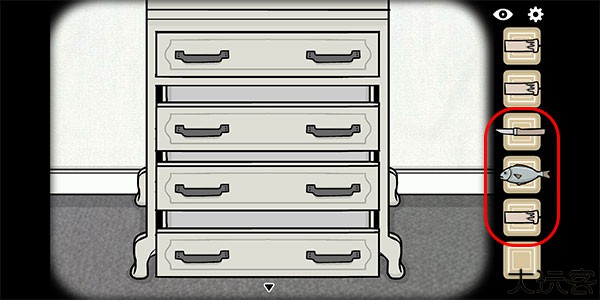3、打开抽屉,第二格是小刀,第三格是一条鱼,第四格是第三支蜡烛。