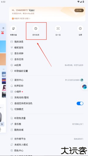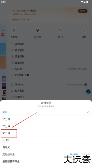3、选择定时关闭功能,设置音乐播放的关停时长。