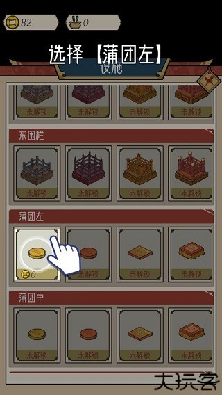 5、玩家可以在这里选择蒲团,另外玩家同时能在这里发现许多装饰,如围栏、佛像、窗户、烛台、立灯、蒲团等等。