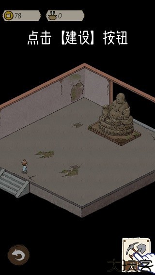 3、现在玩家的当务之急是要修复天王殿内部,点击场景进入天王殿内。之后面对破烂不堪的天王殿内部,先摆上一个蒲团。