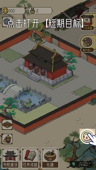 7、如果玩家当下不清楚该干嘛,就在屏幕上点击打开【短期目标】,通过里面的任务引导,完成寺庙的重建,并持续让寺庙进行发展。