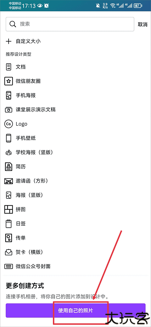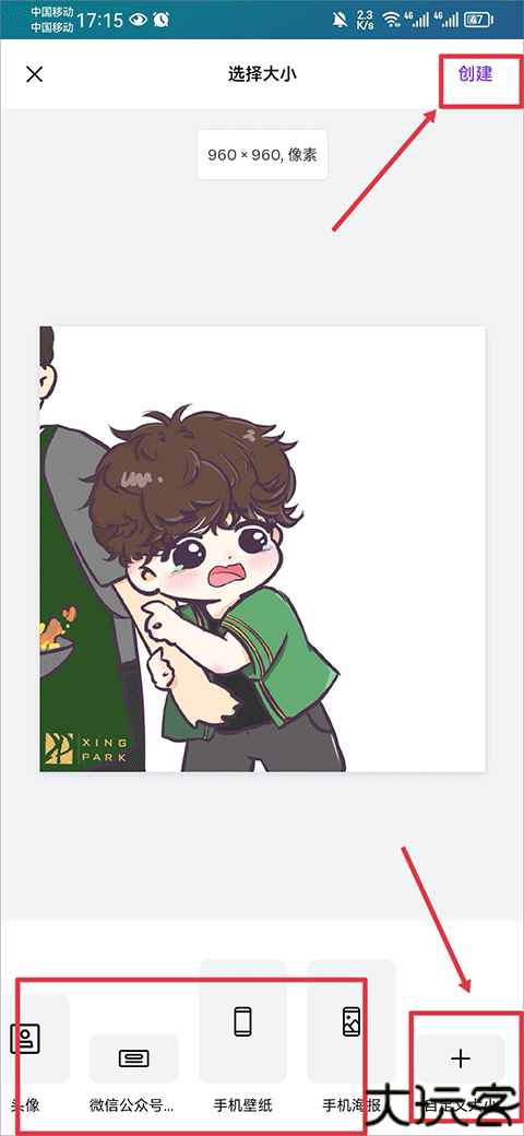 3、在相册中选择照片后,接着选择图片的大小,若下方大小不合适时,可以点击自定义大小,大小选择完成后点击创建即可。