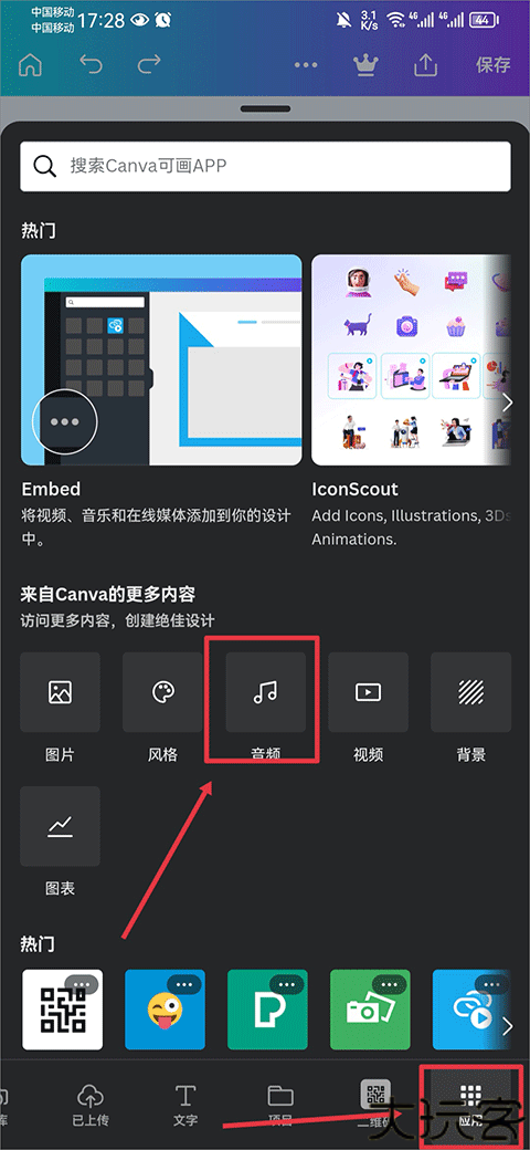 1、点击右下角+号进入菜单界面,并将菜单向左滑动至应用处,然后点击音频。