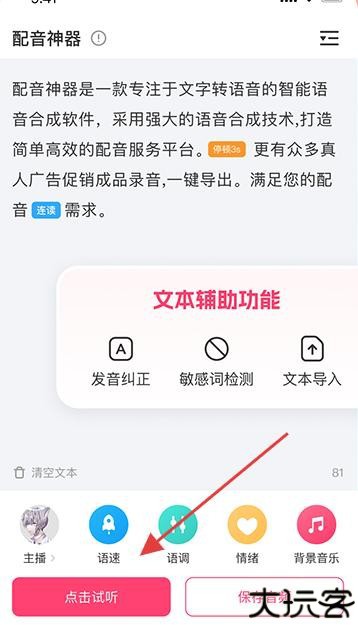 2、配音界面支持文字转语音,有发音纠正等文本辅助功能,可设置语速等参数,点击试听或保存音频,完成配音流程。