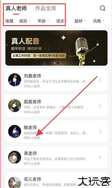 1、作品全库页面可按收藏级别等筛选,展示多位真人配音老师,含简介及选择人数,方便用户挑选适配配音师合作。