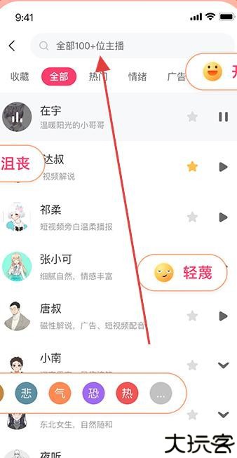 3、主播选择页设搜索栏,能按标签筛选,展示主播音色风格,用户快速找符合需求的主播,助力精准配音创作。