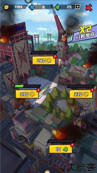 1、控制忍者在不同时间和地点跑酷,躲避障碍物、击杀敌人。