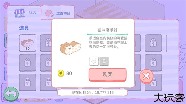 3、玩家可以购买道具、猫塔以及新房等新物品。
