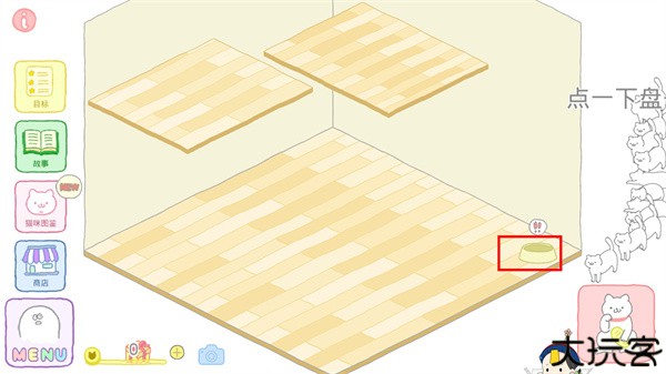 1、刚进入游戏,可以看到有一个猫盆,点击一下就可以装上猫粮了。