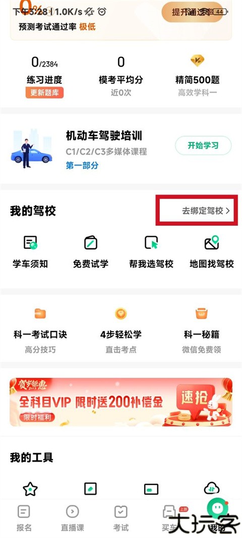 3、点击进入我的个人主页,选择我的驾校绑定驾校。