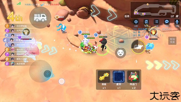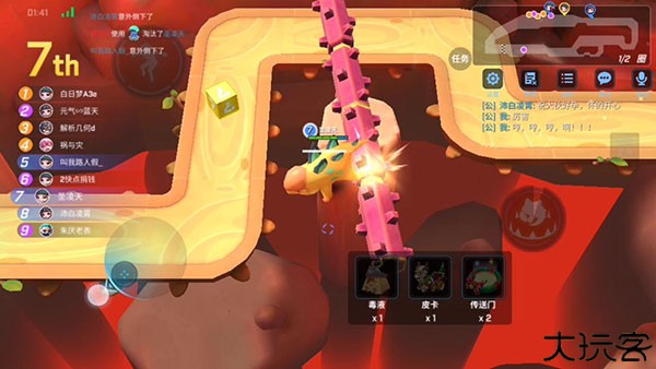 这是一个看脸(运气上的)的路段,说不定刚攒好皮卡捣弹冲锋用出来准备反超第一,直接来个恐龙怼你脸上,简单来说非常的高血压。传送门,护盾是首选。跳高,阻挡箱,滑板都可以跳过恐龙躲避伤害。如果想要配合皮卡,捣弹等载具走,配合气垫效果非常好。如果是在最后一圈,可以刻意呆在第二留一个巡航导弹,这样轻松反超。